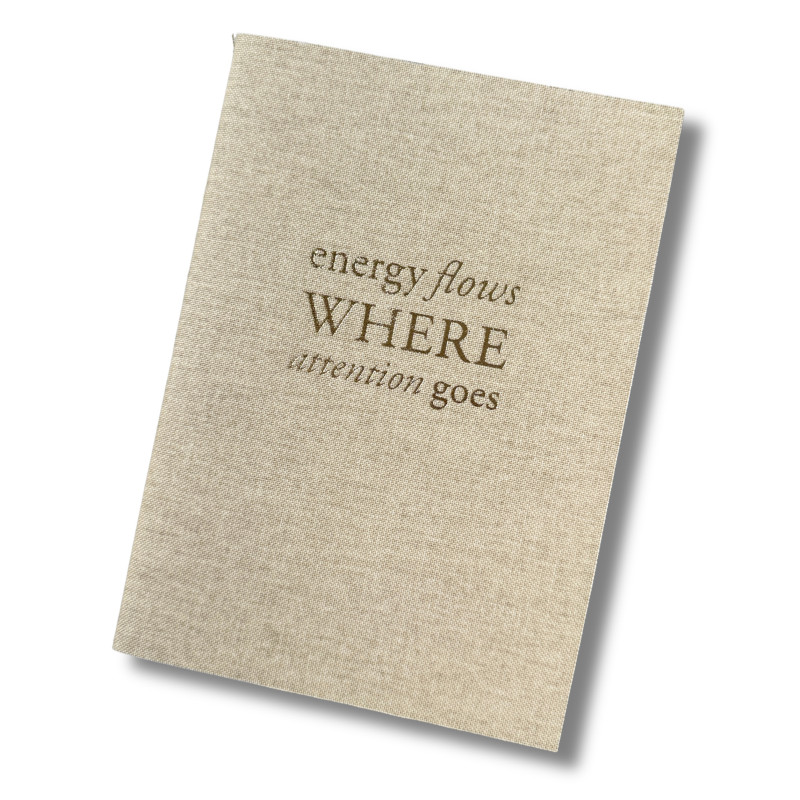 En enkel notatbok med myke permer i vev som er sydd i ryggen og gullpreg på coveret;"energy flows WHERE attention goes" Boken har 36 ark (72 sider) hvitt, syrefritt og sertifisert svensk papir i 100 grams kvalitet....