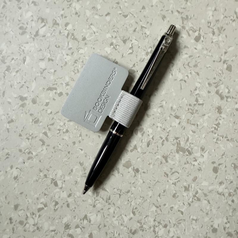 Denne praktiske penneholderen fra Bookbinders Design festes på det bakre coveret, og penn festes i strikken.