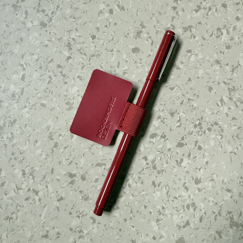 Denne praktiske penneholderen fra Bookbinders Design festes på det bakre coveret, og penn festes i strikken.